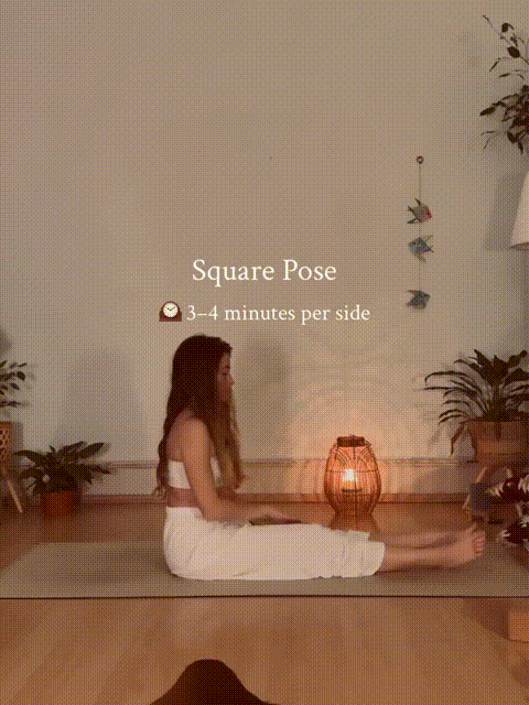 坐立,弯曲左膝盖,左小腿大概平行前端垫子,保持脚回勾,弯曲右膝盖,右小腿放在左小腿上方,膝盖和脚踝分别对齐,可以的话向前屈。