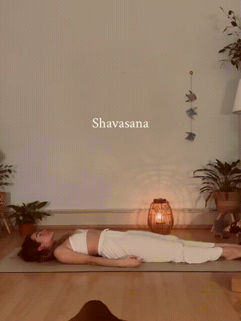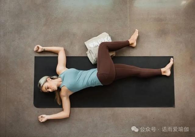 最后在摊尸式里放松。仰卧,腹部内收,腰背贴地,双膝分开,脚尖朝外,双手摊放在身体两侧,掌心朝上,微闭双目,平缓呼吸。